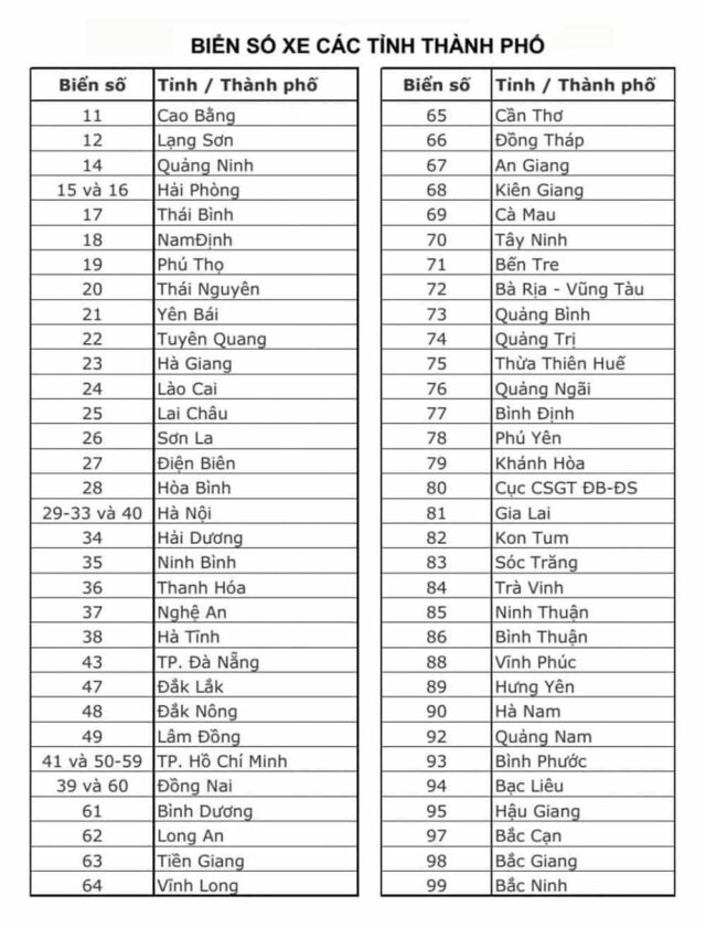 Danh sách biển số ô tô