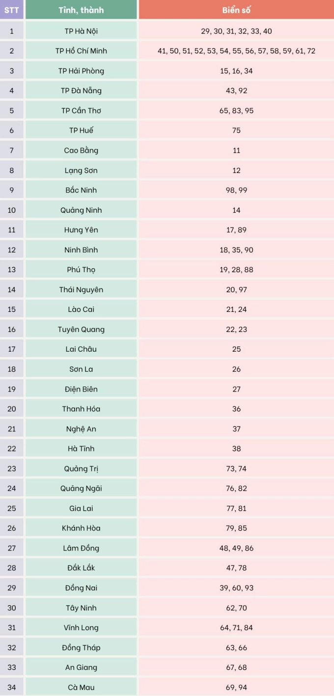 Dưới đây là danh sách cụ thể biển số xe của các tỉnh, thành trên cả nước sau khi việc sáp nhập có hiệu lực kể từ ngày 1/7.